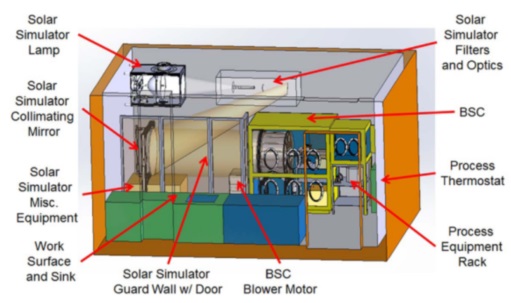 科學家聯系了我們,需要開發(fā)定制的太陽能模擬器,以實現政府的高度優(yōu)先研究計劃。他們對研究高層大氣中的空氣污染效應和光化學具有獨特而特殊的光譜要求??蛻舻臉悠肥沂且粋€裝有懸浮氣溶膠的旋轉圓柱鼓,需要均勻和準直的照明。但是,狹窄的實驗室空間以及連接到樣品桶的其他設備的存在對我們提出的解決方案施加了多個限制。