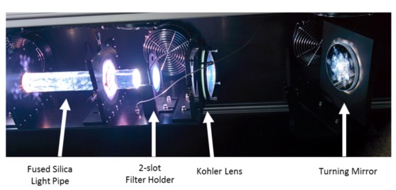 該系統的核心是6500 W氙氣短弧燈和深橢圓形反射鏡,可產生**的光功率并將其重定向到均質系統中。使用定制的高度純化的熔融二氧化硅均質棒來實現樣品鼓中所需的空間均勻性。均質化的光被引導通過Koehler透鏡配置,被轉向鏡折回,然后再次被折回并被準直鏡導入樣品鼓。其中一個焦距為3 m的近乎一米直徑的準直鏡是由Sciencetech的一家鏡片供應商專門生產的,并經過Sciencetech的測試,以確認達到了目標輻照度。
